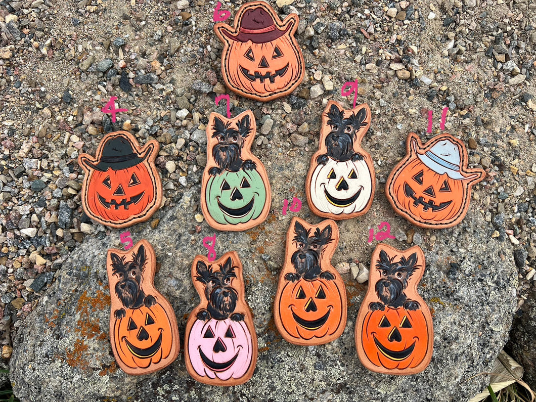 Up for your consideration are pumpkin scarf slides, and Scottie Dog pins.